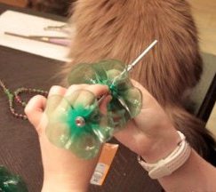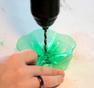 You'll need bottles of different sizes - 2l, 1l and 0, 5l. Cut off the scissors or a sharp knife from each bottle of the bottom 3-4 centimeter. Then at the centre of each " dish " received, drill a hole corresponding to a pre-prepared rod with a cut.